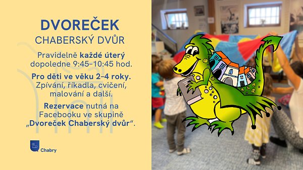 Za týden začínají oblíbené Dvorečky Od září zveme naše nejmenší s doprovodem opět na Dvorečky do Kulturního centra. Těšit se můžete na 60minutový program plný říkadel a písniček, v pestrém programu nechybí ani protahovací cvičení nebo oblíbená výtvarná dílna. Přihlašování na jednotlivé hodiny probíhá na Facebooku ve skupině „Dvoreček Chaberský dvůr“. Vstupné 50 Kč za dítě. Začínáme v úterý 9. 9. Bačkůrky a dobrou náladu s sebou. | |