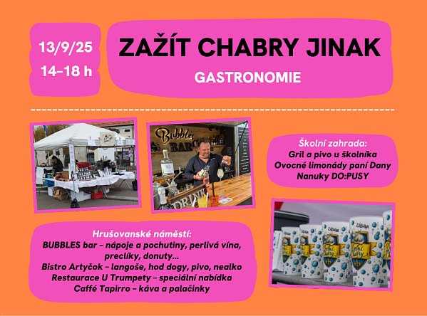 Gastronomie na Zažít Chabry jinak Nejen o tanci, hrách a hudbě je Zažít Chabry jinak 2025. Chybět nesmí ani skvělé jídlo a pití. A nabídka to bude pestrá: pivo, víno, bubliny, langoše , hot dogy, palačinky, limonády, káva, preclíky, donuty, nanuky... To jen tak ve stručnosti Tak co si za dva týdny dáte? | |