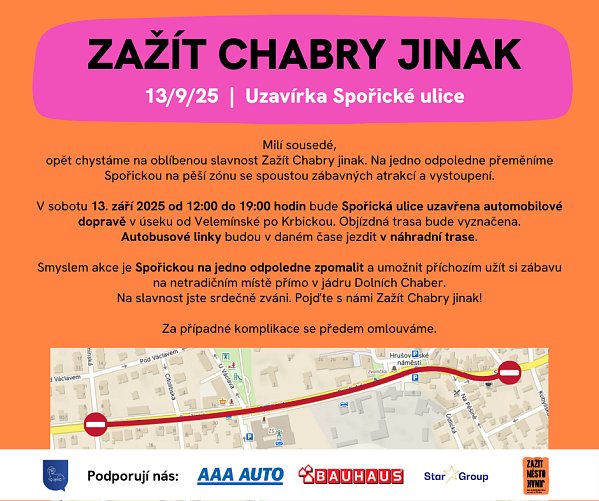 Uzavírka Spořické během akce Zažít Chabry jinak Milí sousedé, jak už dobře víte chystáme oblíbenou slavnost Zažít Chabry jinak 2025. Letos to bude velké, Spořická + tři další stanoviště. Vyžádá si to ale na jedno odpoledne uzavření ulice pro automobilovou dopravu, a to v sobotu 13. 9. v čase od 12:00 do 19:00 hodin v úseku od Velemínské po Krbickou. Objízdná trasa automobilům bude vyznačena a autobusové linky budou v daném čase jezdit v náhradní trase. Za případné komplikace se předem omlouváme. Věříme, že to na jedno odpoledne zvládneme a užijeme si společně spoustu zábavy. Pojďte s námi Zažít Chabry jinak | |