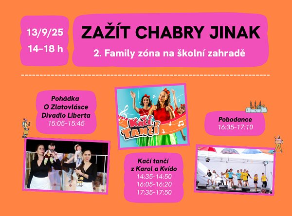 Program druhého stanoviště Zažít Chabry jinak Druhé stanoviště se rozprostře na zahradě základní školy a není to jen tak náhodou – program ve Family zóně je připraven především pro děti. Kačí tančí ze Studia Karol a Kvído se představí rovnou ve třech časech, aby si její vystoupení mohly užít postupně všechny děti. Po třetí hodině se dětští diváci mohou potěšit pohádkou O Zlatovlásce v podání Divadla Liberta. A pokud byste měli toho tance a pohybu málo, v 16:35 je tady oblíbený Pobodance! Tak co, už se těšíte? | |