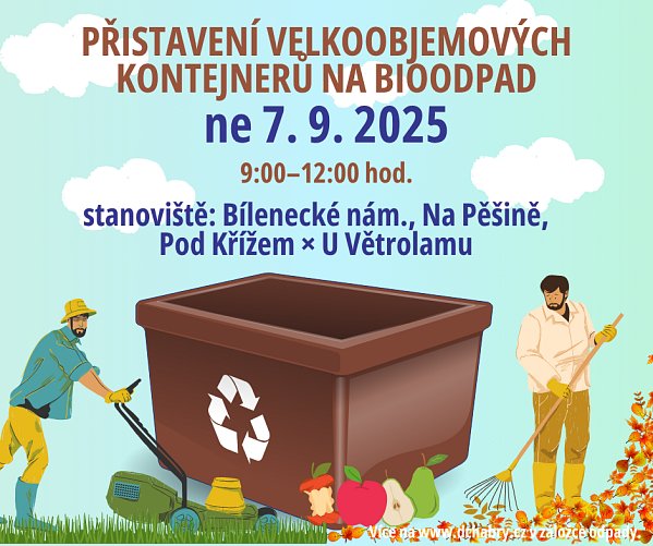 Blíží se přistavení velkoobjemových kontejnerů na bioodpad Svoz bioodpadu proběhne v sobotu 7. 9. na stanovištích Bílenecké nám., Na Pěšině a Pod Křížem × U Větrolamu. Svoz proběhne jako vždy v čase od 9:00 do 12:00 hodin. Podrobnosti naleznete na webu MČ. | |