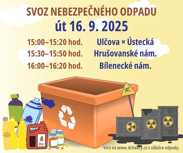 Blíží se sběr nebezpečného odpadu Sběr nebezpečného odpadu proběhne v úterý 16. 9. na stanovištích Ulčova × Ústecká v čase 15:00–15:20, Hrušovanské náměstí v čase 15:30–15:50 a Bílenecké nám. v čase 16:00–16:20. Podrobnosti naleznete na webu MČ. | |
