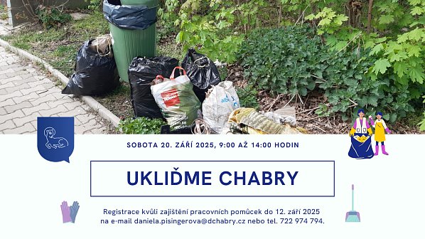Ukliďme Chabry už za necelé dva týdny Velký úklid Dolních Chaber je tady! V sobotu 20. 9. se srazem mezi 8:30 a 9:30 na Hrušovanském náměstí před Chaberským dvorem. Společně „Uklidíme Chabry“. V případě zájmu o pytle a úklidové pomůcky se nezapomeňte registrovat do pátku 12. 9. na e-mailu daniela.pisingerova@dchabry.cz nebo na tel. 722 974 794. Ty se budou vydávat ráno na srazu v Chaberském dvoře, kde budou pracovníky úřadu a gestorem akce místostarostou Stanislavem Vyšínem předány tipy na místa, která jsou vhodná k pořádnému vyčištění. Uklízet ale samozřejmě můžete i v lokalitách, které si vyberete sami. | |
