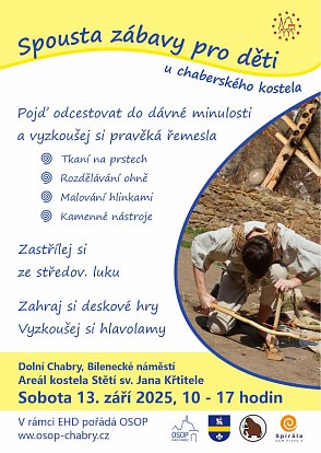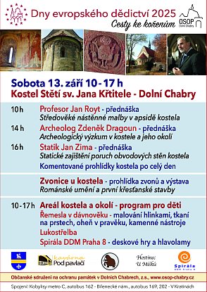 Dny evropského dědictví u kostela OSOP zve na Dny evropského dědictví v kostele Stětí sv. Jana Křtitele v Dolních Chabrech. Bohatý program od 10:00 do 17:00 hodin: přednášky, prohlídka zvonice, výstava, program pro děti. | |