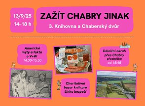 | Program třetího stanoviště Na třetím stanovišti v Chaberském dvoře je v plánu klidnější program plný informací a poznání. Jako první zde vystoupí Filip Šír s přednáškou na téma Americké mýty a fakta o Voskovci a Werichovi. Následně zástupci Rozumné dopravy představí v souvislostech historii a současnou podobu návrhu dálničního okruhu. A po celé odpoledne bude v knihovně možnost zakoupit bazarové knížky, přičemž výtěžek z prodeje bude věnován Lince bezpečí. | |