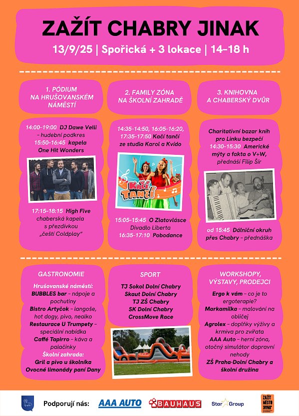 Zažít Chabry jinak již tuto sobotu! A je to tady! Týdny jsme se těšili, v sobotu sousedská slavnost konečně vypukne! Kromě Spořické, na které bude sídlit hned několik účastníků včetně mobilní 30metrové nafukovací překážková dráhy, se můžete těšit na Family zónu na školní zahradě, přednáškový program v Chaberském dvoře a především pak pódium plné hudby na Hrušovanském náměstí. Bude to velké, bude to skvělé, bude to Zažít Chabry jinak. Určitě přijďte. Těšíme se na vás! | |
