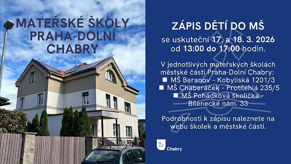 Zápis dětí do mateřských škol v Dolních Chabrech se uskuteční 17. a 18. 3. 2026 v čase 13:00–17:00 hodin. Zápis se týká těchto mateřských škol: